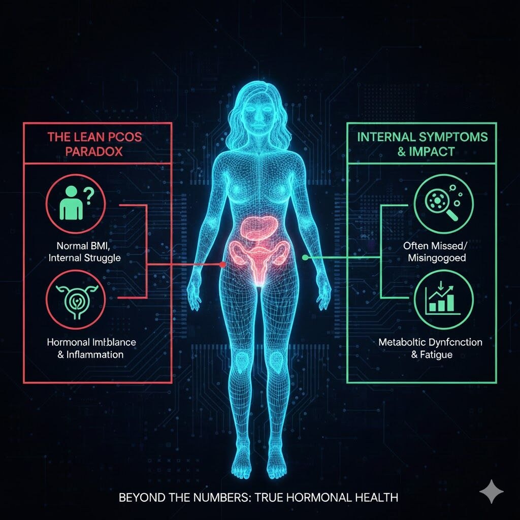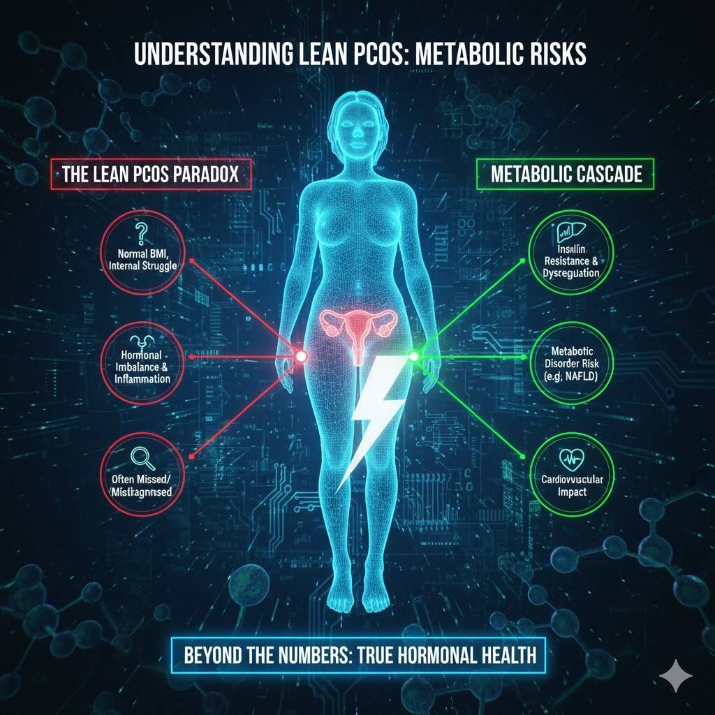 Lean women can still face impaired glucose tolerance, elevated serum insulin, insulin resistant patterns, metabolic abnormalities, and a higher risk of cardiovascular disease. These changes often develop quietly, without excess weight or abdominal fat.