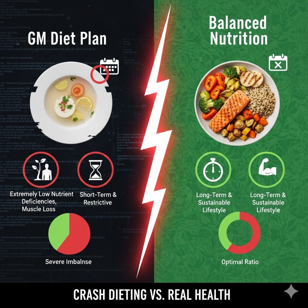 The GM diet, general motors diet and similar gm diet plan approaches rely on only vegetables, only fruits and refined carbs with excess salt. They ignore essential vitamins, essential nutrients, balanced meals and favourite foods, making long term weight management difficult.
