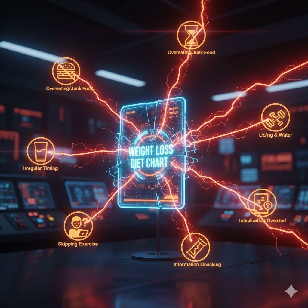 A diet chart for weight loss often breaks down when portion control weakens, how many calories are misjudged, extra calories creep in, or more calories are consumed than expected.